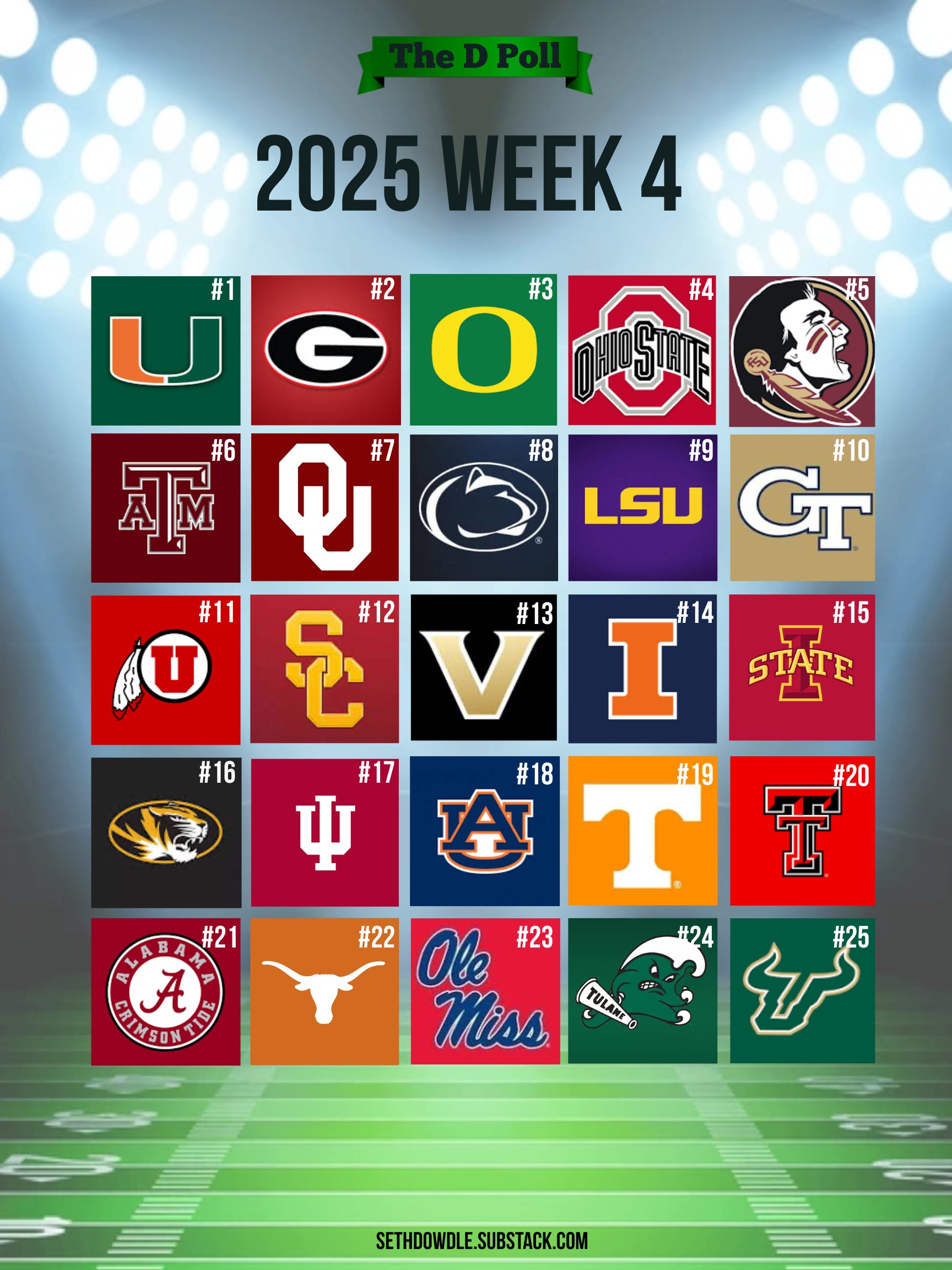 Right off the rip, let me remind you that the D Poll values vibes and feelings above all else, and then adds in winning after the fact. It’s also important to remember that this ranking is a fluid entity, especially early in the season. As new data points come in, teams are going to drastically shift around. I’m positive that as the season progresses, the variability of these rankings will decrease. For now, however, the difference between the previous week’s poll and this week’s will remain quite large.